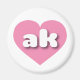 Este ímã apresenta um coração cor-de-rosa vibrante contendo as letras maiúsculas e maiúsculas em negrito, branco, arredondado, uma abreviação lúdica para o Alasca, a última fronteira.