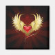 Coração vermelho brilhante de um anjo com asas ouros brilhando no fundo vermelho-radiante escuro decorado com um padrão.