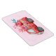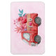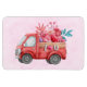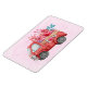 Um ímã flexível com um carrinho de cor vermelha. Corações de carregando e flores no fundo. Eu te amo, escrito do lado. Impressionante e adorável. Rosa claro de fundo padronizado.