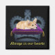 Um triste corgi deitado sobre uma almofada roxa com bruxelas douradas, gráfico de uma coroa ao fundo, texto totalmente personalizável