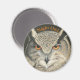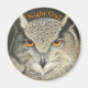 Um lápis colorido e desenho de caneta de uma Coruja Excelente Coroa Coroa com olhos laranja perfurantes.