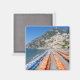 Costa de Amalfi de Positano Beach - com filas de guarda-chuvas azuis e laranja.