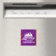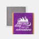 Um ímã com uma frase de aventura otimista que diz: Outro dia outra aventura. Uma imagem com o sol a espreitar por detrás de algumas montanhas. Colocado sobre um fundo roxo.