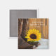 Anuncie sua próxima fazenda rural ou núpcias temáticas com o charmoso País Sunflower Western Wedding Salve o Magnet da Praça da Data. Este casamento rústico, informal e elegante, mantém o ímã de data com uma fotografia floral acinzentada de botas de cowboy castanhas, flor de girassol amarelo e madeira de celeiro castanho em cetim branco.