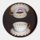 Magneta de lembrete da máquina de lavar louça limpa ou suja. Na moda e xícaras e discos brancos de porcelana. Lábios de batom na xícara de café suja.
