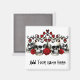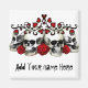 Uma imagem gráfica com quatro crânios horizontais com rosas vermelhas entre eles e corações pretos e vermelhos e rolagem.