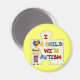 Uma parte grande do quebra-cabeça, um coração compor de partes do quebra-cabeça, uma figura menina de cabelo triguenha da vara, e o texto que me lê "amam uma criança com autismo" em t-shirt da consciência do autismo, em canecas, em cartões, em etiquetas, em sacolas, em ímãs, em chaveiro, em jornais, em mousepads, e em outros artigos do roupa e do presente.