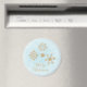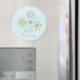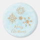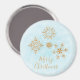 Um ímã com ilustração de flocos de neve de ouro rico com formas cristalinas elegantes. Um fundo azul-claro e gelado. O texto diz Feliz Natal.