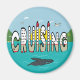 A design de cruzeiro utiliza a palavra "cruzeiro" para criar um navio de cruzeiro que navega para destinos exóticos estrangeiros através dos mares azuis. Inclui sol, âncora, funis a vapor e portholes de cabine para criar um gráfico divertido para fãs de férias de cruzeiro.