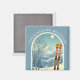 Magnet from a wonderful skiing holiday in the beautiful Crystal Mountain, Washington! This magnet features an arch with a stunning blue-grey mountain landscape and retro ski boards in an orange tribal pattern in the foreground.