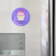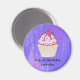 Um ímã de aniversário personalizado com um nome e desenhado com uma ilustração de um cupcake delicioso. Glacé rosa e garoa de chocolate. Um cupcake amarelo e uma framboesa no topo. Meu Deus! O fundo é uma textura de abstrato púrpura com pequenos corações espalhados.