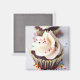 Uma fotografia moderna de três cupcakes seguidos. Cada cupcake de chocolate tem glacé de baunilha e faíscas arco-íris.