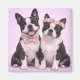 This charming illustration features an adorable Boston Terrier couple sitting side by side against a soft blush pink background. With their signature tuxedo markings, perky ears, and expressive eyes, this design perfectly captures the lovable personality of the breed. Coordinating floral accessories—a floral bow tie for him and a matching floral crown for her—add a sweet and romantic Valentine’s touch while keeping the artwork elegant and timeless.