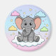 An adorable cartoon baby elephant sitting comfortably on a soft cloud surrounded by pastel colors and stars. This cute and funny design features the text "I'm Ele-Fun-t." Great for kids and animal lovers