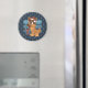 A round magnet with illustration of cute German Shepherd with a present on a starry night dark blue background, illustrated by Radka2D