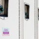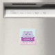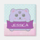 Adorable kitten holding up personalised sign on pink and blue polka dot background.