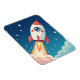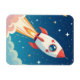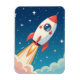 Cute red and white rocket blasting off in space with whimsical stars and clouds.