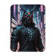 Essa imagem intensa retrata um demônio ameaçador samurai, adornada com uma roupa futurista e escura e uma máscara com olhos e chifres vermelhos brilhantes. Num ambiente urbano iluminado por neon, inspirado pela estética do cyberpunk, o personagem se coloca entre numerosos sinais e símbolos iluminados, sugerindo uma surpreendente paisagem urbana de alta tecnologia.