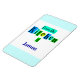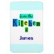 Um retrato personalizado "Da Cozinha de" com script e letras bonitas de cozinha em preto contra blocos coloridos de azul, verde e lacre, com bordas claras de cima e baixo.