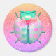 Uma joaninha em verde-menta, coberta de corações em cores rosa, roxo e verde. Ela tem um arco de queixo em volta do pescoço, e é colocada sobre um fundo brilhante de roxo, rosa e pêssego.