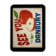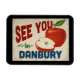 Um encantador ímã de geladeira de viagens vintage Danbury Connecticut com uma adorável maçã vermelha, juntamente com um texto divertido no estilo retrô que diz, "Veja você em Danbury"