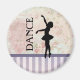 Um ímã bonito com uma silhueta de bailarina em um fundo bonito. Esta elegante dançarina de balé está em pé nos dedos, apontada com os braços esticados graciosamente. A palavra "DANCE" escrita ao lado desta dançarina elegante. O fundo é composto por um padrão de aparência vintage shabby com flores. A parte inferior do design tem faixas de lavanda de estilo vintage alternando em cores escuras e claras.