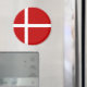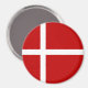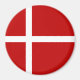 A bandeira vermelha e branca da Dinamarca, ou Dannebrog, tem uma Cruz Nórdica ou Escandinava. O vermelho é o fundo, a cruz é branca. A bandeira dinamarquesa é mostrada aqui num ímã redondo.