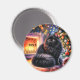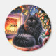 Um gatinho preto giro numa lareira. A cena de Natal no fundo.