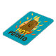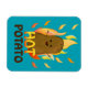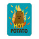 Diversão desenho animado batata marrom com um grande sorriso feliz, pontos para os olhos e palitos para os braços. Ele está cercado por chamas quentes amarelas e laranjas. Abaixo dele em texto laranja e amarelo está a palavra QUENTE e abaixo disso em texto marrom está a palavra BATATA. Design divertido e excêntrico para dar risada.