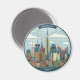 Uma ilustração da Nova Iorque capta a ascensão do horizonte majesticamente em segundo plano, mostrando marcos como o Empire State Building, evocando o espírito dinâmico da cidade e a atração do eterno.