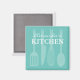 Imã de geladeira personalizada com utensílios de cozinhar de cozinha. Adicione seu próprio nome. modelo de tipografia na moda. Ferramentas de comércio; uísque de faca e espátula. Cor de fundo azul-lacrimejante/azul-turquesa ou personalizada. Festa bonitinha para a festa de janto.