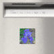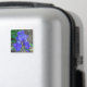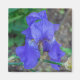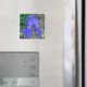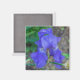 Uma fotografia de perto de uma bela flor azul da íris impressa em uma imã de geladeira quadrada.