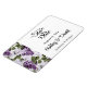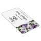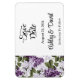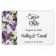 O ímã de Salvar a Data é mostrado em um layout formal clássico na cor branca com texto preto e texto em script destacando os nomes da Noiva e do Noivo e acentuado com uma bela impressão floral de lilases.