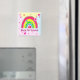Arco-íris colorido com letras, maçã vermelha, flor e texto "Voltar à escola" em cores pastosas - presente perfeito para uma menina