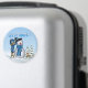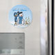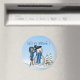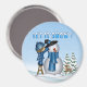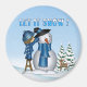 Deixe-o nevar Snowman Round Magnet mostra um fundo de neve com neve caindo neve, neve coberta de pinheiros, uma criança em um banco colocando os toques finais em seu boneco de neve. A criança está vestida de azul e o boné de neve tem um cachecol azul e um chapéu preto. Há uma rena olhando pelos pinheiros. A neve coberta de texto azul é Deixar nevar! Perfeito gafanhoto de presente de Natal ou a favor da Festa de Natal! Este design foi criado com o uso de artwork©delightful-doodles.com (http://delightful-doodles.com/) e gráficos originais do DGD (http://dollargraphicsdepot.com/)