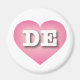 Este ímã apresenta um coração cor-de-rosa tranquilo e legal com um centro lavado em branco contendo as letras maiúsculas brancas em negrito DE, a abreviação oficial do estado de Delaware, o primeiro estado.