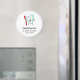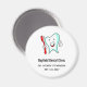 Um ímã com uma ilustração de um estilo de desenho animado, grande dente branco sorrindo alegremente segurando uma escova vermelha de dente e dando aos polegares um sinal de cima.