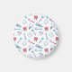Magneta com um padrão teórico dental. Apresentando ilustrações coloridas de dentes, escovas de dentes e várias ferramentas dentárias.