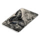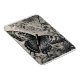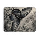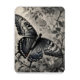 Borboleta preta e branca com galhos de árvores e folhas desenhando.
