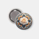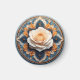 Representação artística de uma rosa central rodeada por padrões florais detalhados, criada a partir de cortes de papel em camadas em tons azuis e laranja. Demonstrando criatividade e habilidade artesanal intrincada dentro de uma composição circular geométrica.