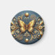 Representação artística de uma borboleta ouro ornamentado cercada por elegantes cordas florais e ornamentais sobre um fundo azul contrastante, valorizando temas de luxo, elegância e decoração.