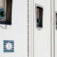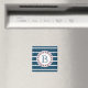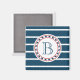 Design de temas náuticos com decoração em forma de monograma em forma redonda sobre fundo listrado a azul e a branco
