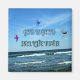 Uma bela vista do oceano com ondas correndo para a costa. O céu é tão azul com algumas nuvens brancas. No céu estão as palavras "Deus é bom o tempo todo" com 3 pássaros coloridos diferentes voando ao redor dessas palavras.