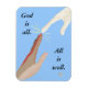 Mãos, um humano multirracial, uma energia pura, chegando, tocando, conectando com uma faísca de energia, com "Deus é tudo. Tudo está bem", está impresso em ímanes.