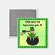 Leprechaun No Pote © Sunny Mars Designs. Este imã quadrado de Dia de São Patrício mostra um desenho animado de um duende sentado sobre um pote de ouro com seus braços no ar e uma arma apontada para sua cabeça com as palavras "beba para cima ou o duende entende!" embaixo.