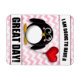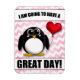 Um pequeno ímã pinguim bonito desenhado com um padrão diagonal de fevron cor-de-rosa, e a mensagem pensadora positiva: "Vou ter um dia excelente!"