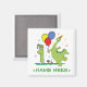 Primeiro aniversário, um dinossauro verde-giro brontossauro com chapéu de festa e balões, vulcão ao fundo, com texto que diz "Eu tenho 1" em verde.