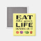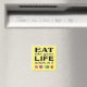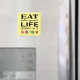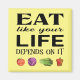 Coma como sua vida depende de seu slogan em design tipográfico com ilustrações de vegetais e frutas em estilo aquarela em um fundo amarelo ensolarado. Para malhação, vegan, dieta baseada em plantas, declaração alimentar vegetariana ou saudável na sua cozinha.