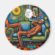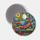 Um homem reclina-se num sofá verde vibrante rodeado por papel de parede colorido e giratório. segurando sua cabeça dolorosa e pensando 'Ai, dói-me a cabeça'.