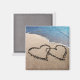 Linda e original foto de dois corações escritos ou desenhados na areia ao longo da água azul do oceano para significar amor e romance em um ímã. Conceito de excelente para os próximos Dias de os namorados e casamentos de praia de verão.